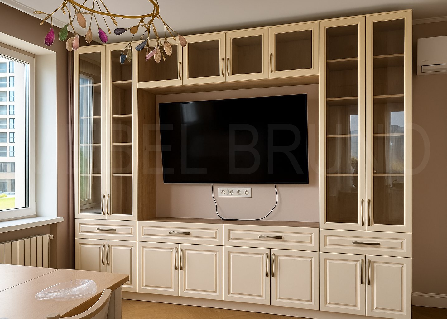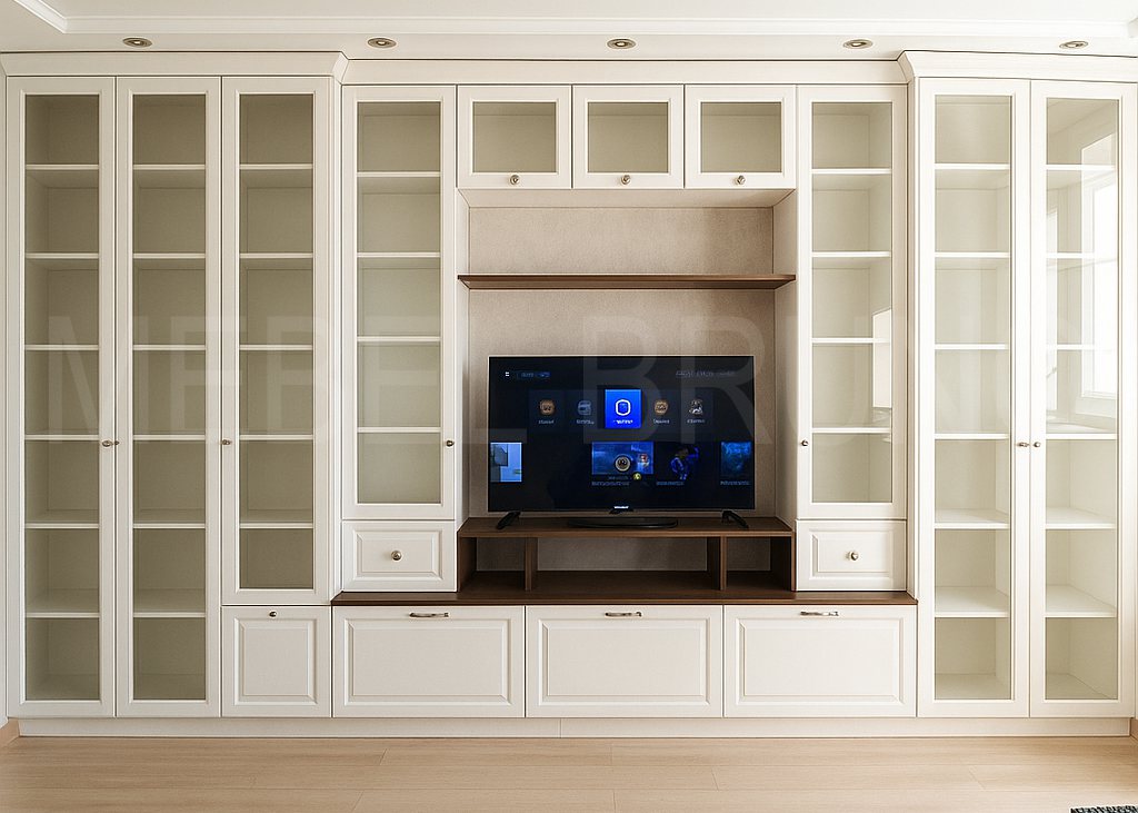 Эта стенка — отличный пример “классики на каждый день”: светлые фасады делают интерьер легче, а витрины со стеклом добавляют глубины и аккуратной декоративности. Внутри — много продуманного хранения: верхние секции для редких вещей, нижние шкафы и ящики — для всего, что должно быть скрыто. ТВ-зона п...