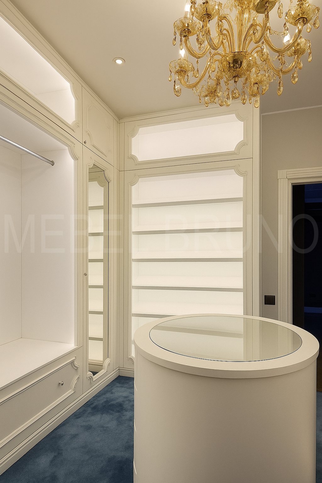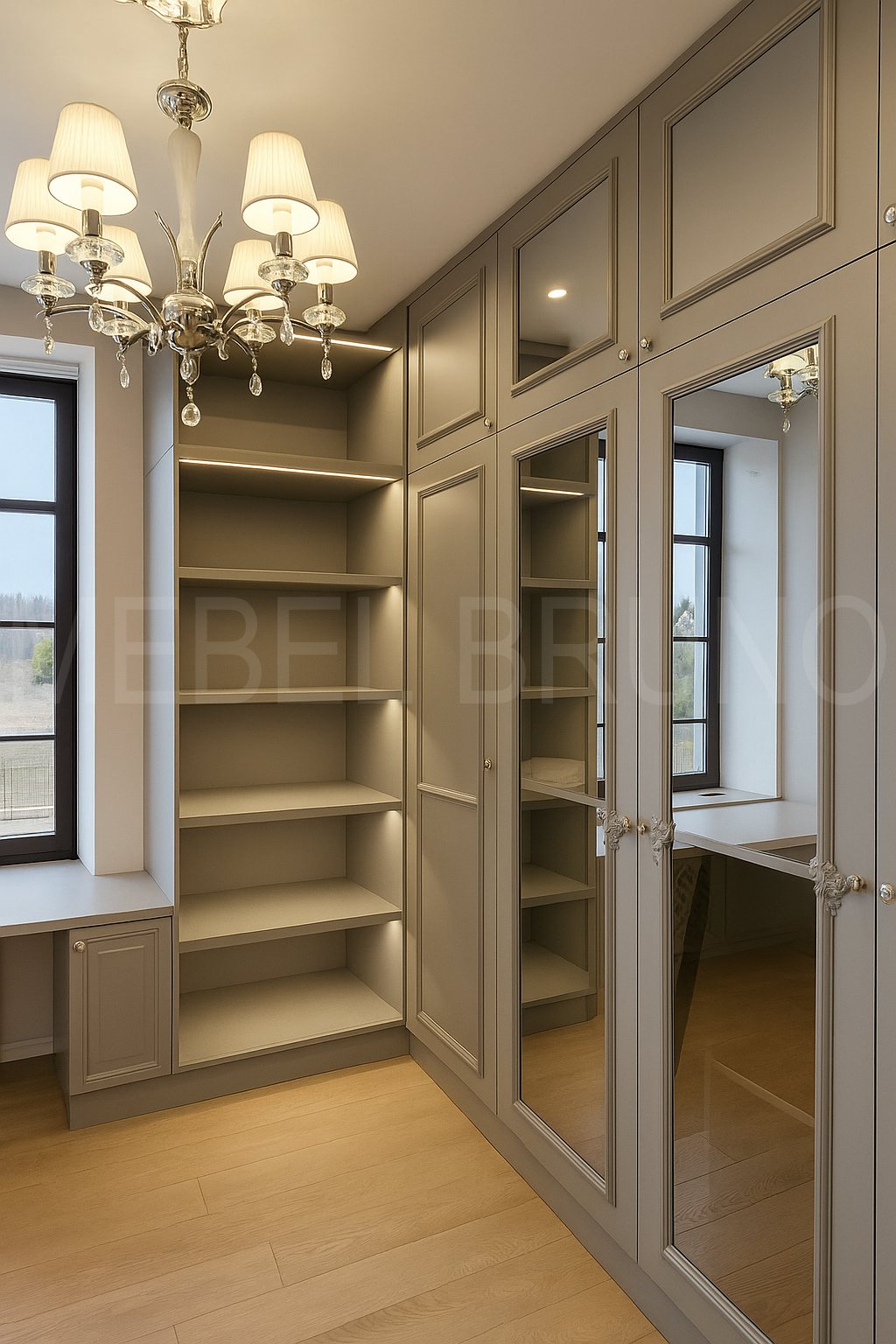 Эта гардеробная сделана так, чтобы в ней было удобно жить каждый день. Зеркальные фасады визуально расширяют пространство и добавляют света, а открытые полки с подсветкой превращают хранение в красивую витрину для аксессуаров и одежды. Светлая эмаль поддерживает неоклассику интерьера и делает композ...