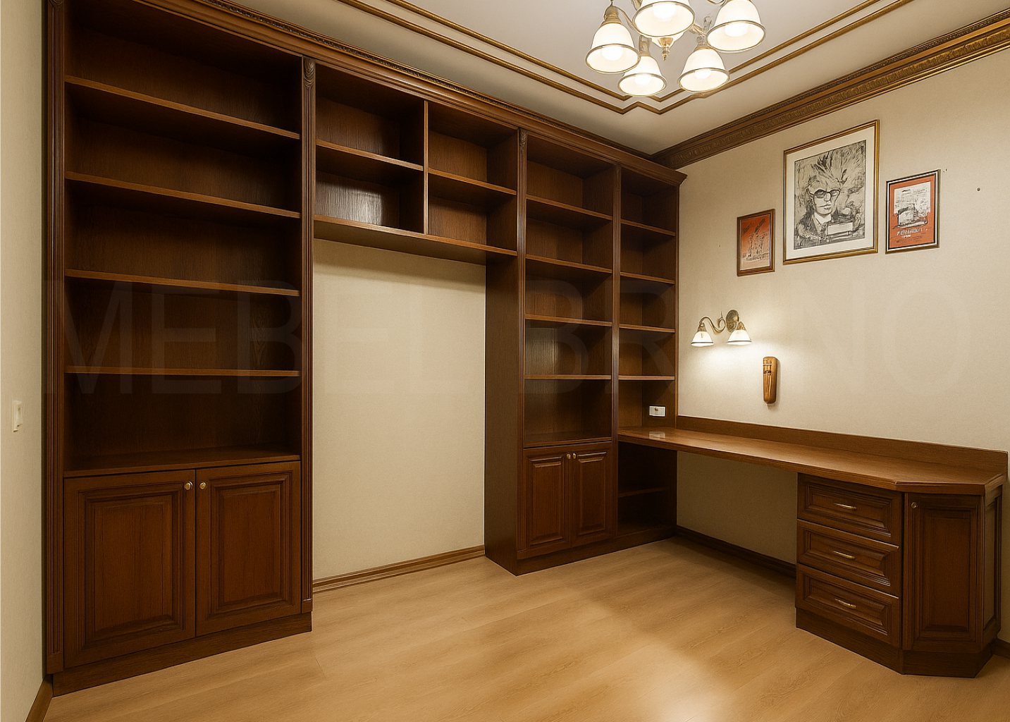 Эта библиотека — пример “большого” проекта, который делает интерьер завершённым. Стеклянные витринные секции визуально облегчают масштаб, а тёплая древесная отделка добавляет уюта и статуса. Полки рассчитаны под книги и коллекции, а нижние модули и ящики берут на себя всё хранение, которое лучше скр...