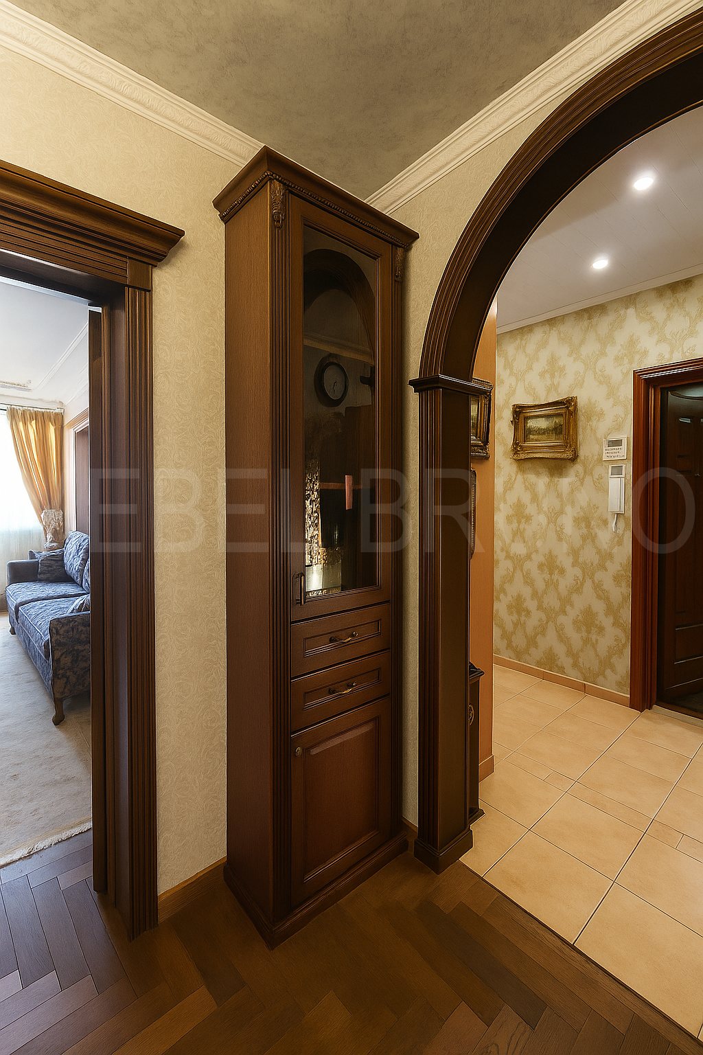 Иногда именно узкая ниша или простенок решают впечатление от прихожей. Мы сделали витрину-пенал так, чтобы она выглядела статусно и работала на порядок: сверху — остеклённая секция для декора и коллекций, ниже — удобные ящики для мелочей и закрытый модуль для хранения. Тёплая древесная отделка и кла...