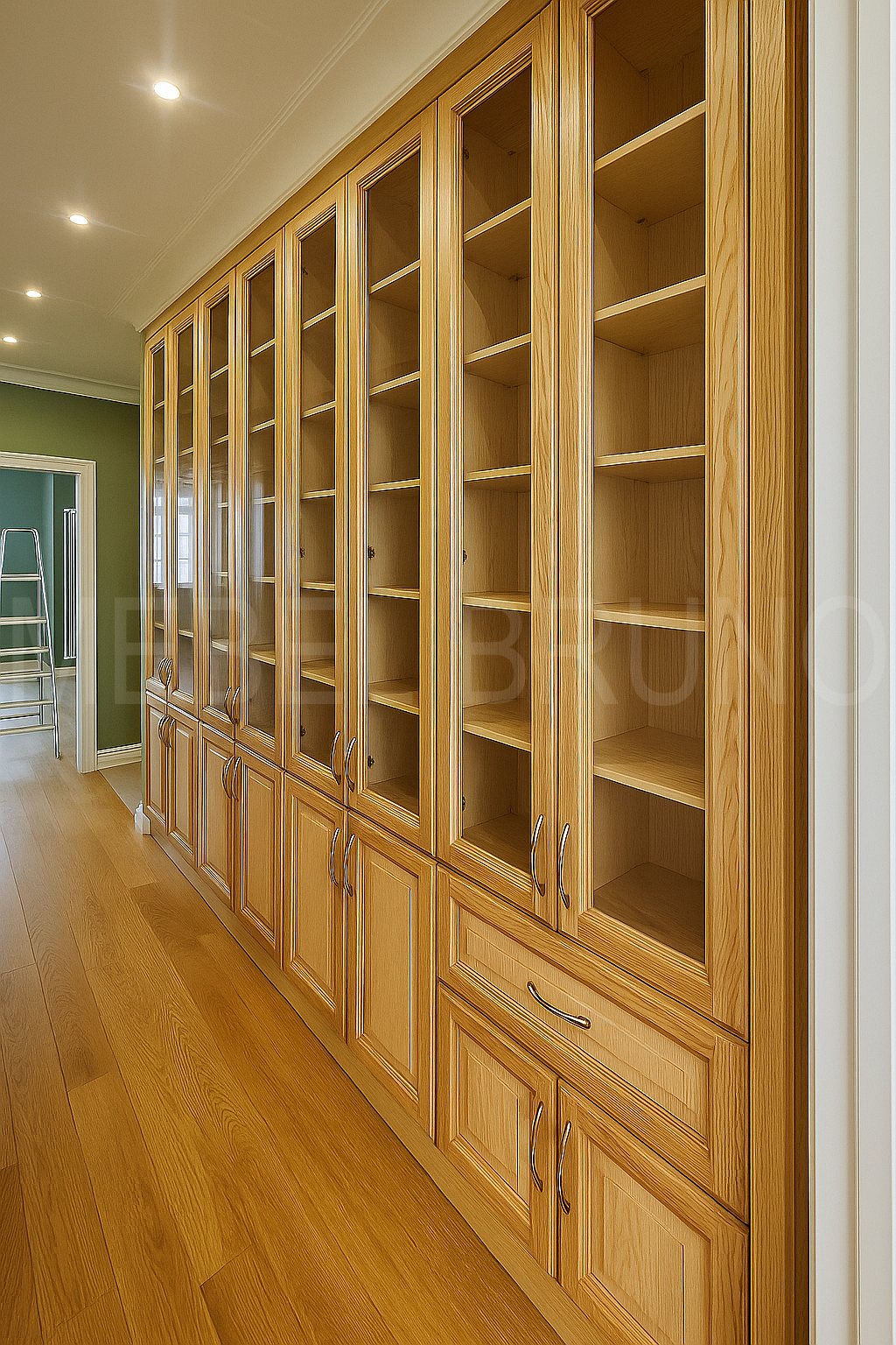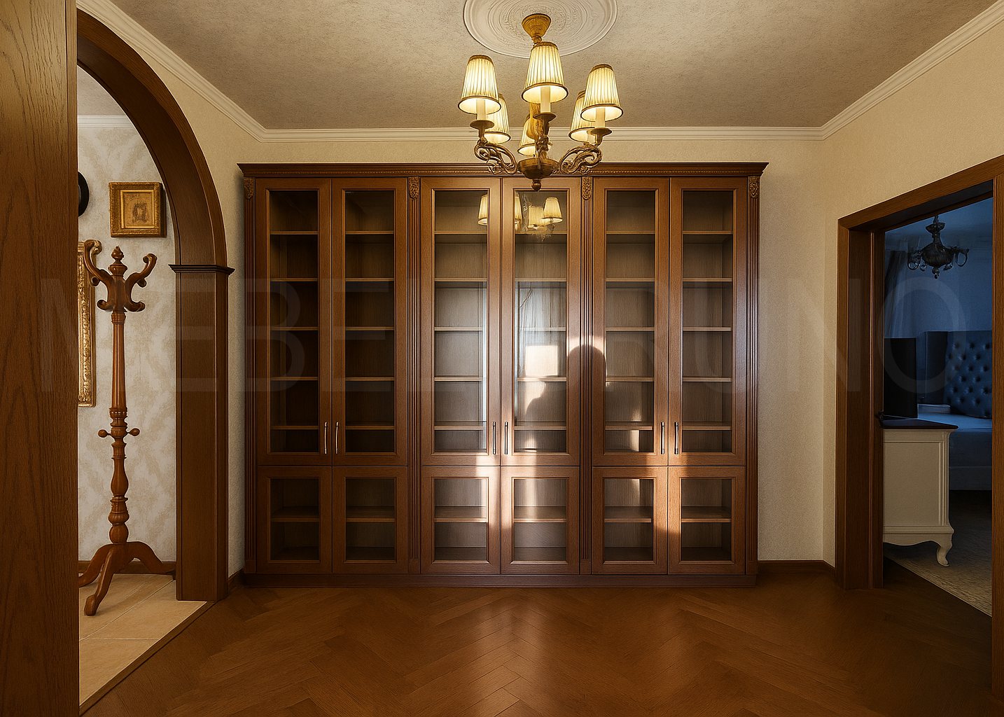 Реализованный проект Мебель Бруно: библиотека на заказ с витринными секциями и стеклянными фасадами, классический стиль и отделка под дерево. Изготовили и установили под размеры помещения в Москве/МО.