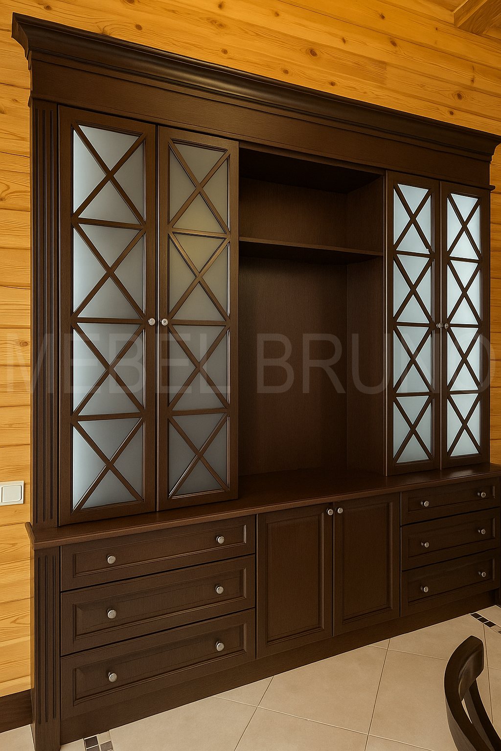 Эта ТВ-зона сделана так, чтобы хранение выглядело как часть интерьера. Стеклянные витрины с раскладкой “крест” добавляют статус и лёгкость, а нижние модули и ящики берут на себя всю “бытовую” часть — от мелочей до техники. Тёплая древесная отделка делает пространство уютным, а строгая геометрия фаса...