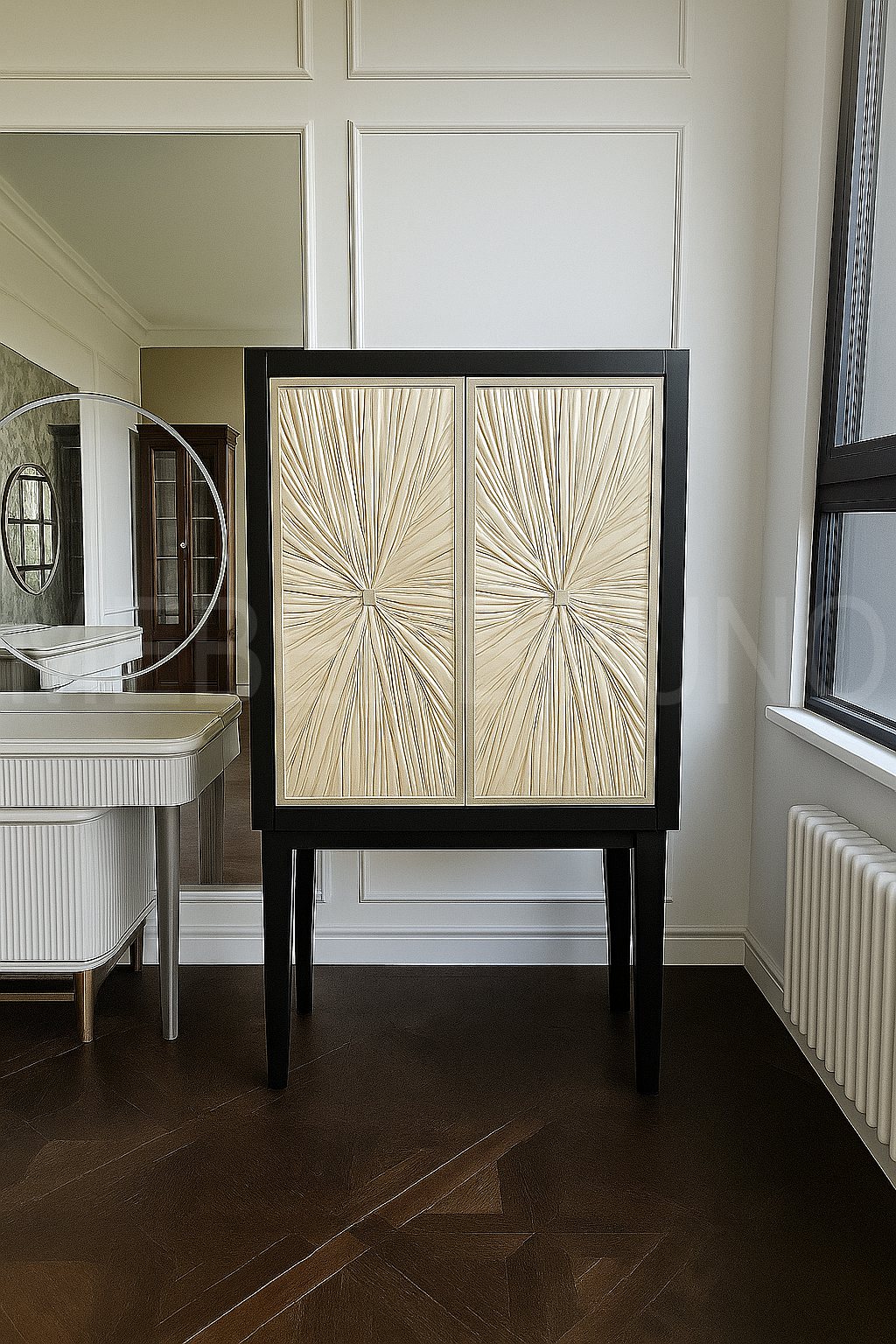 Этот буфет — тот самый акцент, который делает интерьер запоминающимся. Рельефные фасады с эффектом “лучей” играют светом и создают объём, а контрастная рама подчёркивает графику арт-деко. При этом вещь остаётся практичной: внутри — полноценное хранение, снаружи — чистая эстетика. Проект выполнен по ...