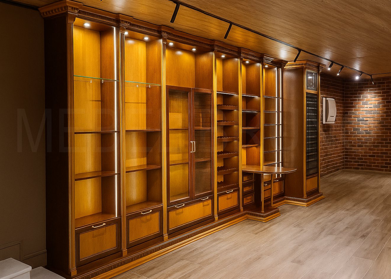 Этот проект — про атмосферу “private club” у вас дома. Мы объединили библиотеку, витринные секции и винный модуль в одну цельную композицию: тёплое дерево, стекло и подсветка создают мягкий вечерний свет и подчёркивают коллекции. Продуманное хранение закрывает всё лишнее, а барная зона делает простр...