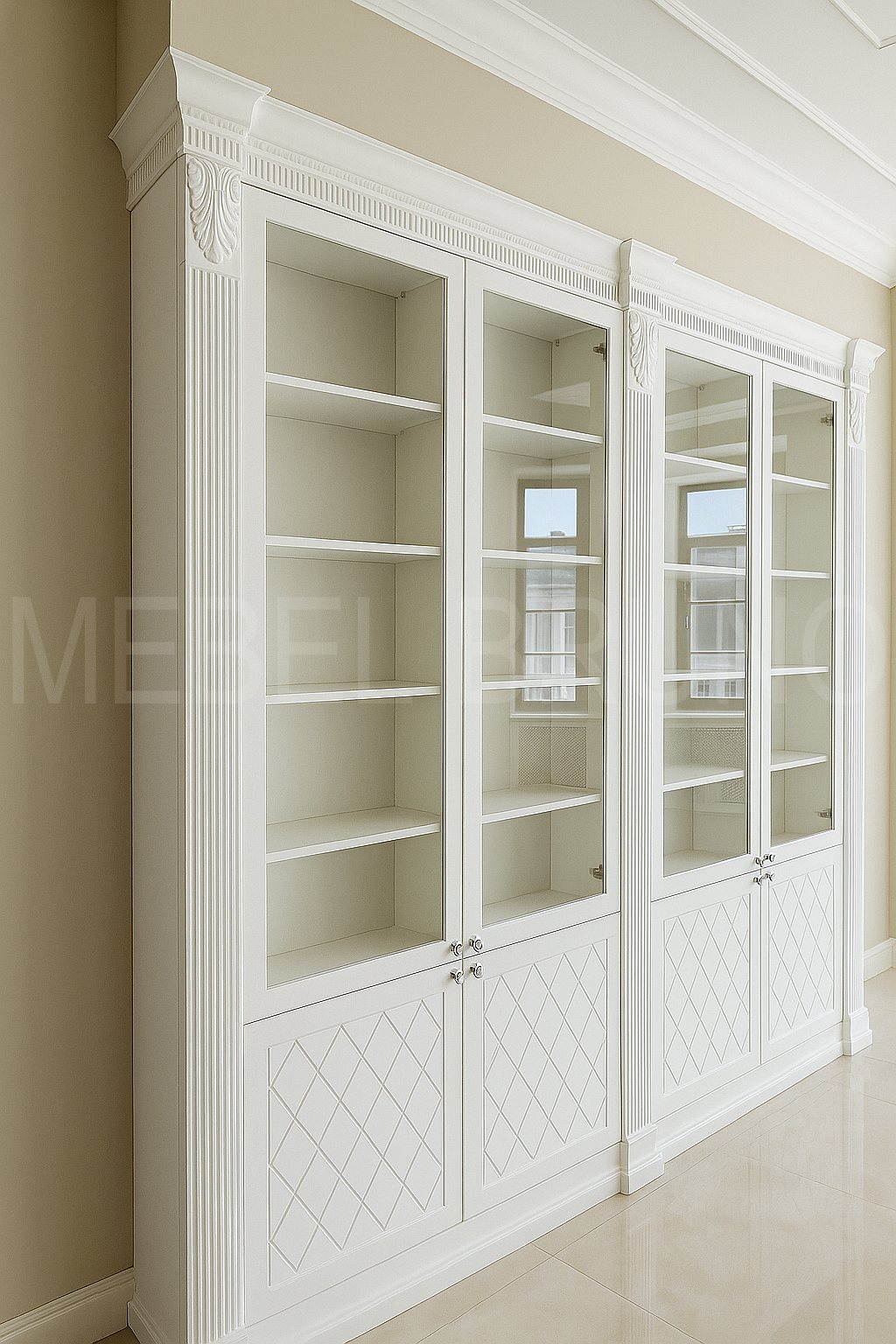 Эта библиотека-витрина — про свет, порядок и статусную классику. Стеклянные фасады делают композицию визуально лёгкой, а декоративные пилястры и карниз придают интерьеру “архитектурность” и завершённость. Нижние секции прячут всё бытовое, оставляя на виду только книги и декор. Выполнили по индивидуа...