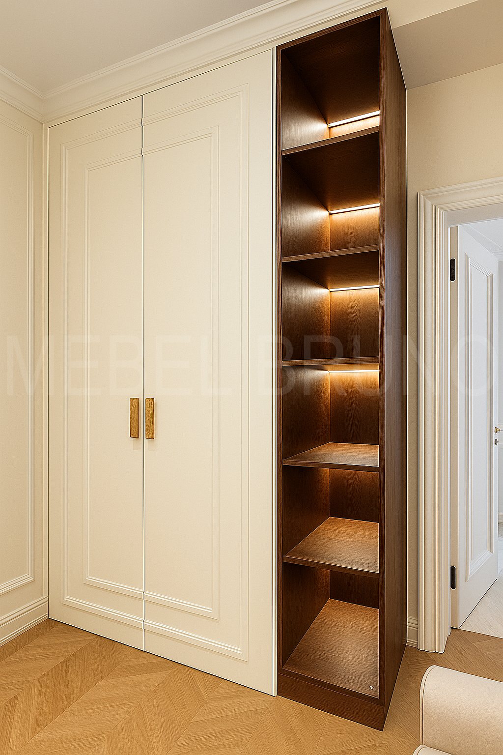 Этот проект — про баланс практичности и “вау-детали”. Светлый шкаф аккуратно растворяется в интерьере и даёт максимум закрытого хранения, а боковой стеллаж под дерево с подсветкой становится тёплым акцентом и красивой витриной для декора. Подсветка добавляет уютный вечерний сценарий, а контраст мате...