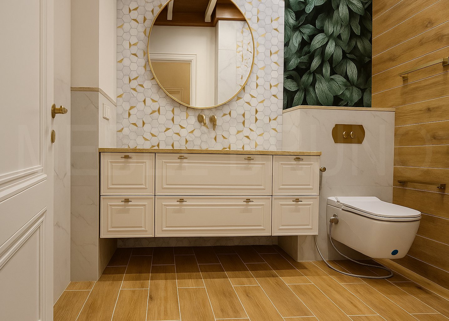 Ванная — пространство, где особенно важны порядок и удобство. Мы сделали подвесную тумбу так, чтобы она выглядела легко и при этом была максимально практичной: вместительные ящики, аккуратная столешница и идеальная подгонка под коммуникации. Латунная фурнитура добавляет “дорогой” акцент, а классичес...