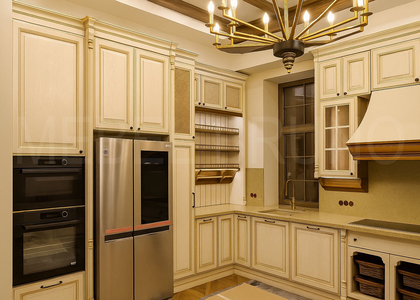 Эта кухня — пример классики, которая всегда выглядит “дорого” и актуально. Светлые фасады с аккуратным декором делают пространство светлее, а витринные секции добавляют интерьеру глубины и статуса. Мы продумали эргономику под ежедневные сценарии: удобная угловая зона, продуманное хранение, интеграци...