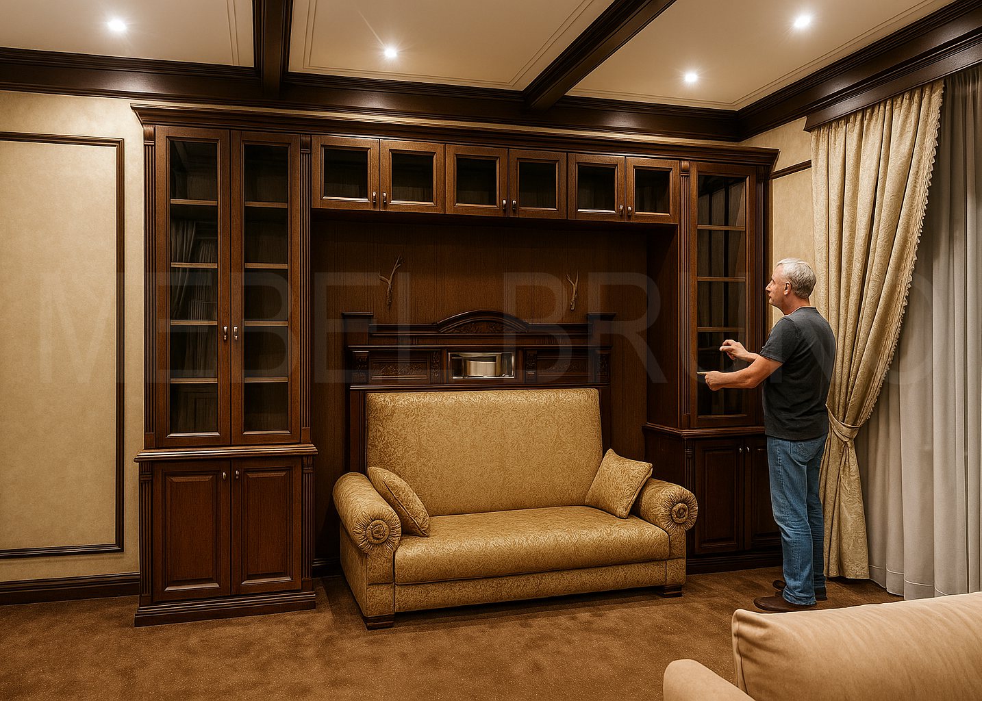 Эта гостиная — пример “настоящей классики”, где мебель задаёт тон всему интерьеру. Витринные секции со стеклом подчёркивают статус, а верхние и нижние модули берут на себя хранение, оставляя пространство аккуратным и собранным. Тёплая древесная отделка и выверенная симметрия делают композицию цельно...