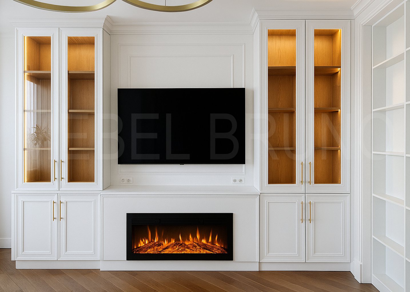Элегантная каминная композиция с ТВ-зоной — готовая работа, где каждая деталь работает на статус и уют. Светлая эмаль, золотые акценты и витрины с подсветкой дают ощущение “дорогого” интерьера без перегруза. Закрытые секции берут на себя хранение, а открытые ниши подчёркивают декор и создают мягкий ...