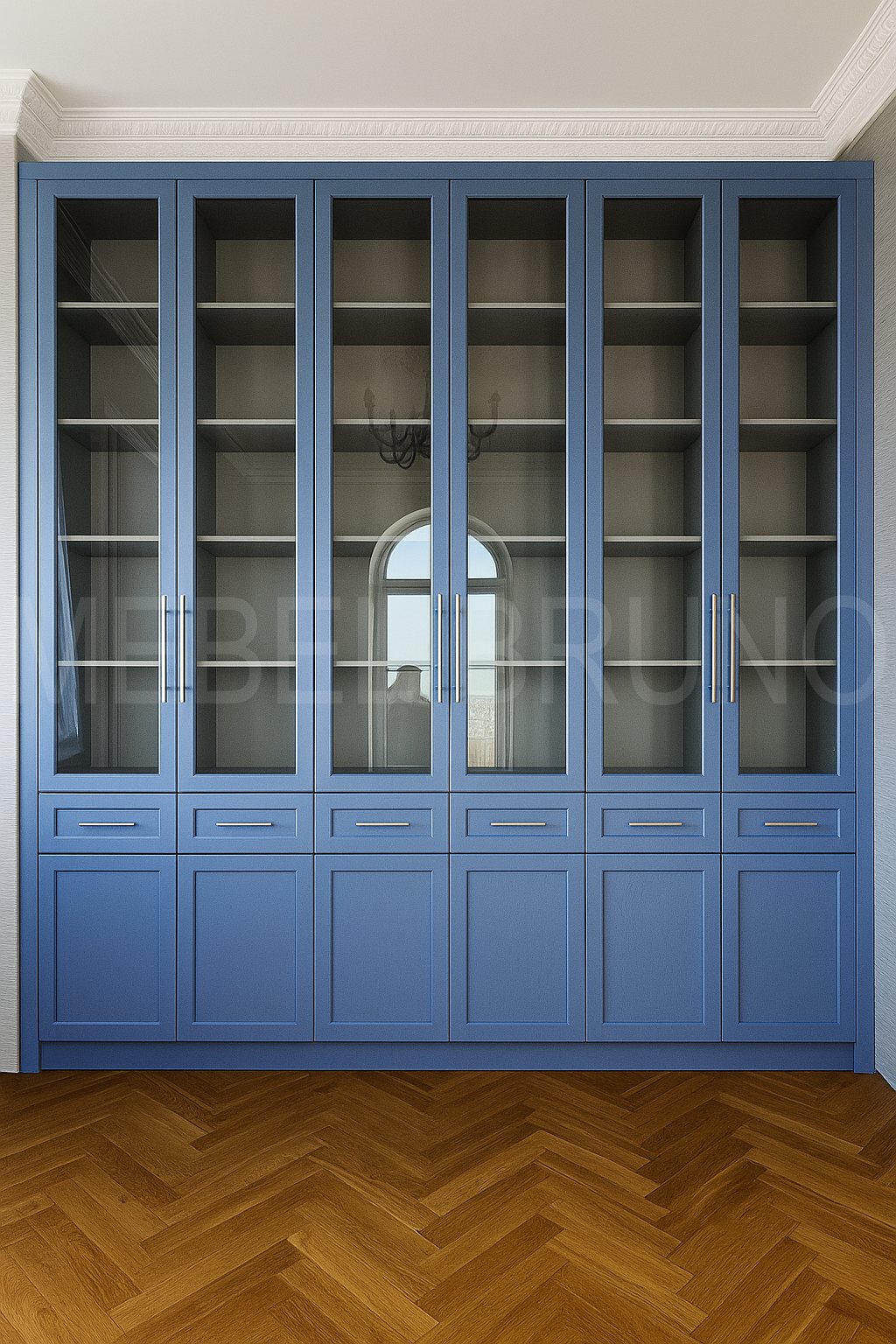 Этот проект — про смелый цвет и идеальную систему хранения. Синий шкаф-витрина во всю стену сразу становится акцентом комнаты, а стеклянные фасады визуально “облегчают” большую композицию. Нижние секции и ящики закрывают всё бытовое, оставляя на виду только то, что хочется показать. Выполнили по инд...