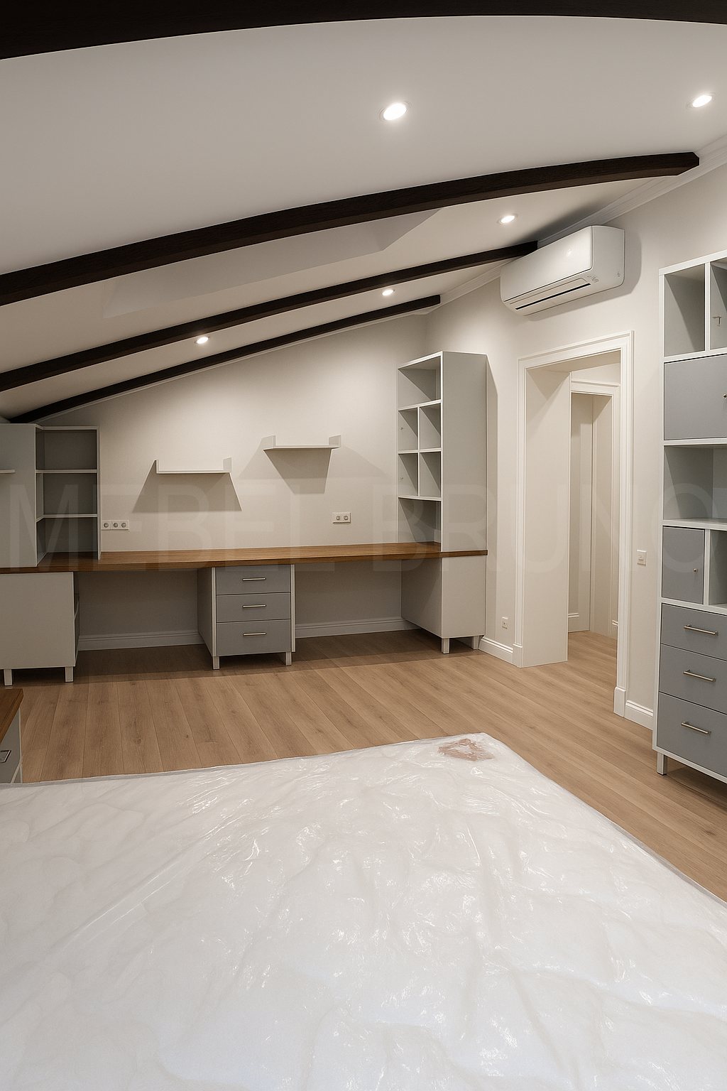 Мансарда — сложное пространство, но именно здесь мебель “на заказ” раскрывается лучше всего. Мы спроектировали длинную рабочую зону вдоль стены и добавили системы хранения так, чтобы каждый сантиметр работал: удобные тумбы, открытые секции и аккуратные полки. Светлая палитра делает комнату визуально...