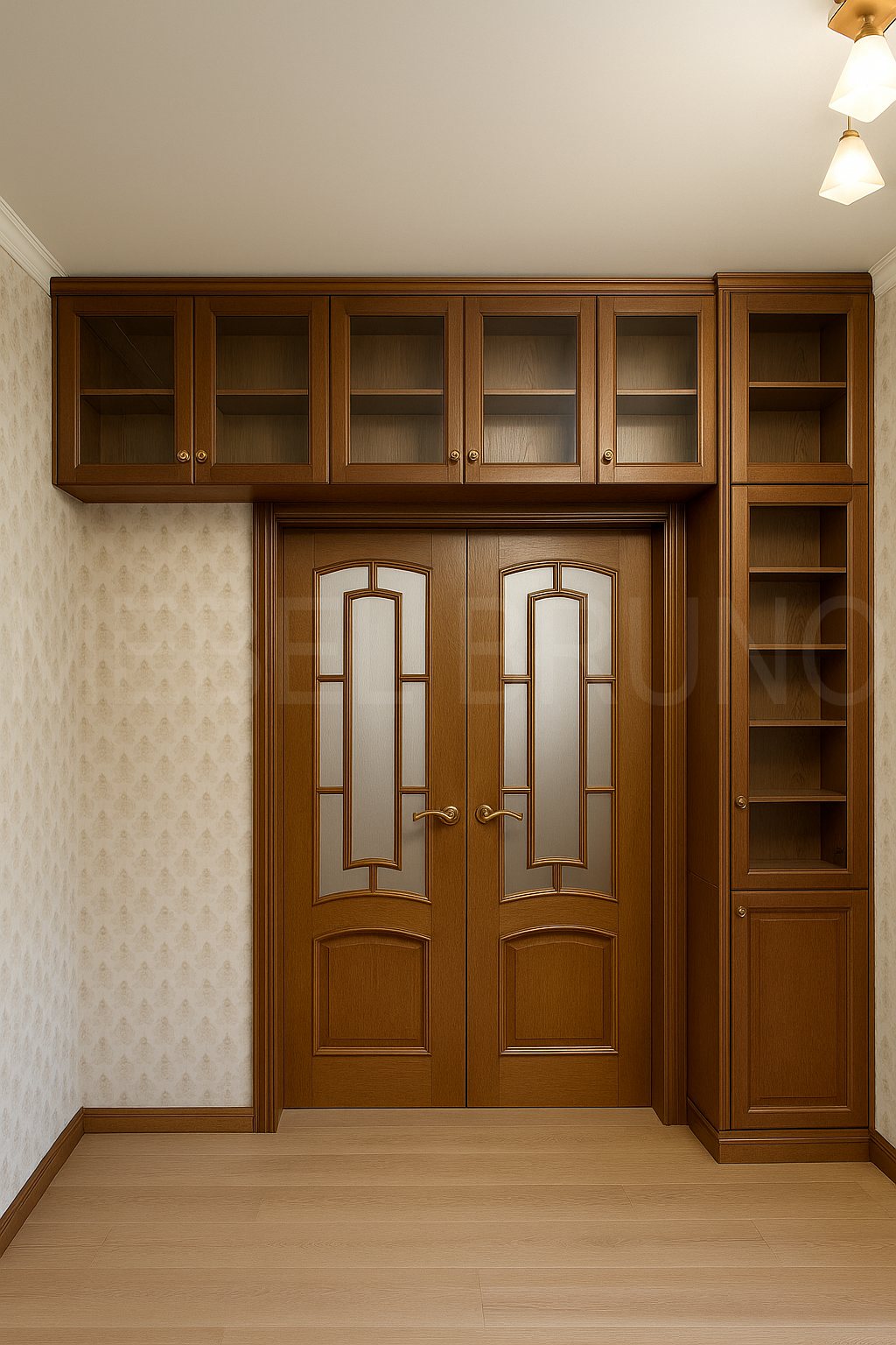В этом проекте мы “забрали” в пользу хранения то пространство, которое обычно пустует — зону над дверным проёмом. Антресольные шкафы добавили объём, не утяжеляя интерьер, а боковой пенал со стеллажными полками сделал композицию завершённой и удобной в ежедневном использовании. Тёплая древесная отдел...