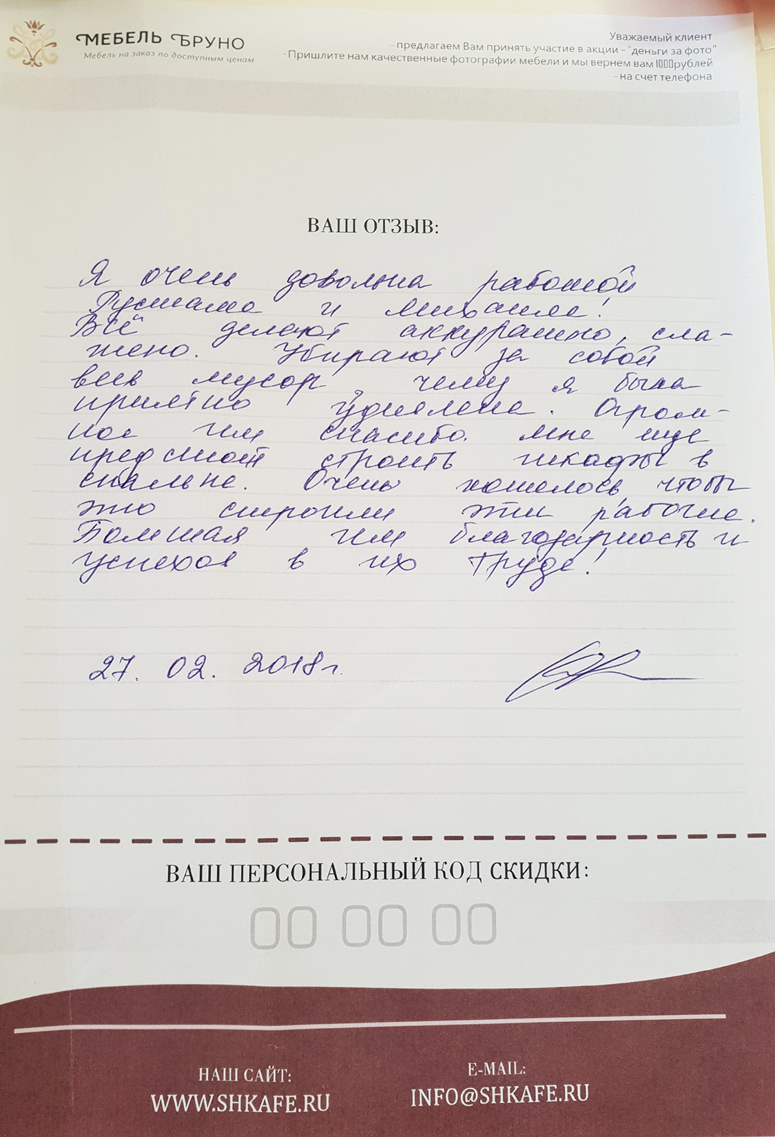 Отзыв клиента :Благодарность!!! Хотим выразить благодарность Мебель Бруно, за наши шкаф в спальнюВсе сделали очень хорошо, качество мебели идеальное, нет ни каких запахов как где прочитали в интернете, сроки конечно не малые 45 рабочих дней, нам привезли в срок, монтажники Дима и Женя все подняли и ...