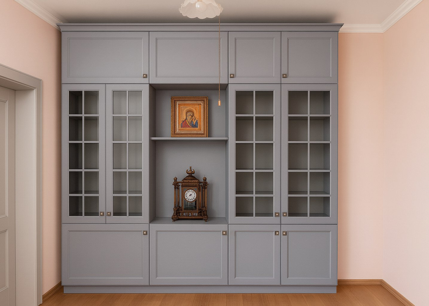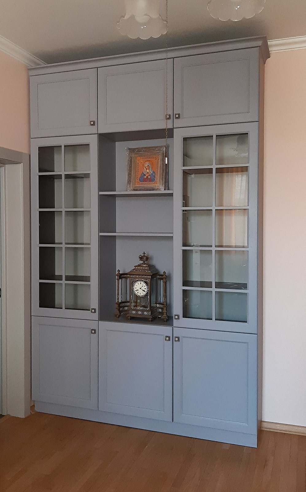 Пристенная библиотека-витрина для гостиной или кабинета в стиле современной классики: фасады из МДФ, окрашенные в серо-голубой оттенок с матовым финишем, боковые секции со стеклянными дверцами с раскладкой, центральная ниша с открытыми полками под декор и нижний ярус с глухими фасадами, корпус в тон...