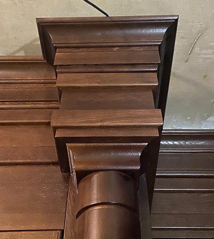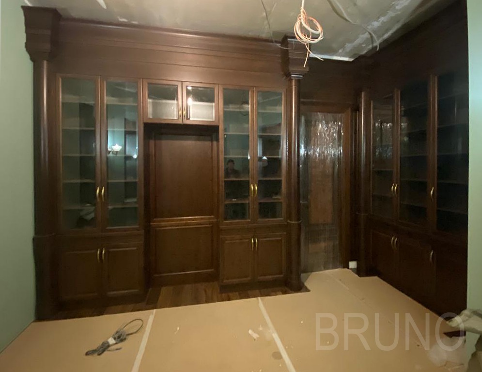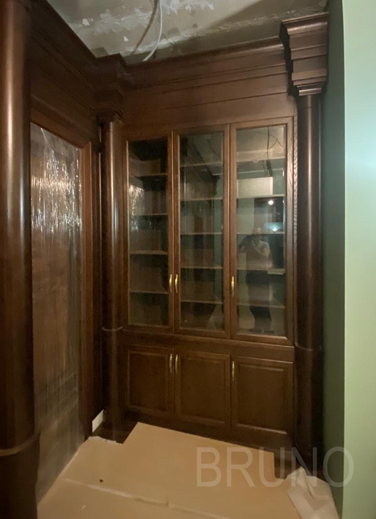 Классическая встроенная библиотека, выполненная по индивидуальному проекту с акцентом на симметрию, натуральные материалы и декоративные элементы.Стиль: классика — колонны, карниз, филёнчатые фасады, тёплый оттенок древесины.Фасады: фасады классического стиля из массива дуба, покрытие тонировка Орех...