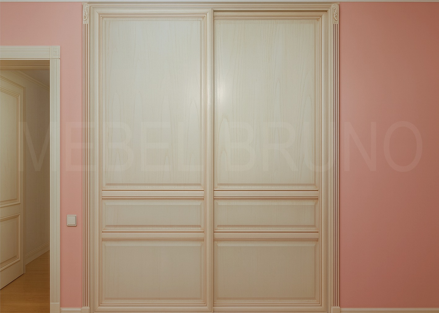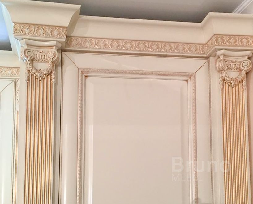 Встроенный шкаф-гардероб с распашными фасадами для спальни или детской в классическом стиле: фасады из МДФ, окрашенные в светлый оттенок слоновой кости с мягкой золотой патиной и филёнками, по краям — декоративные пилястры, корпус в тон, фурнитура с доводчиками и скрытыми ручками