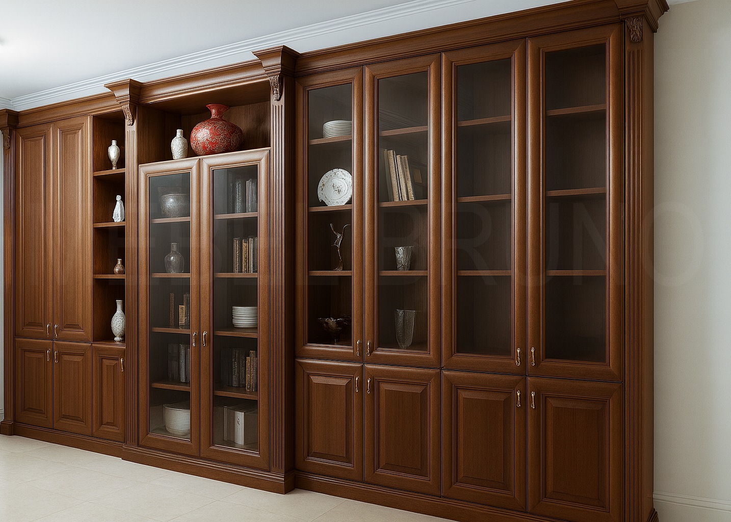 Пристенная библиотека-витрина для кабинета или гостиной в классическом стиле: фасады из МДФ/шпона, тонированные под тёплый орех с матовым финишем, верхний ярус — стеклянные дверцы и открытые полки для книг и декора, нижний — глухие фасады для закрытого хранения, декоративные пилястры и карниз, изящн...