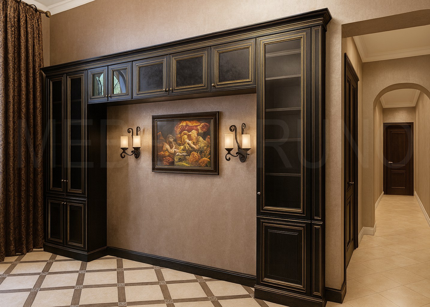 Стеновая композиция-библиотека для гостиной или холла в классическом стиле: фасады из МДФ, окрашенные в глубокий чёрно-шоколадный оттенок с золотистой патиной, витринные секции со стеклянными дверцами и филёнчатыми фасадами, верхний ярус — закрытые шкафы, корпус в тон, изящные ручки под бронзу, цент...