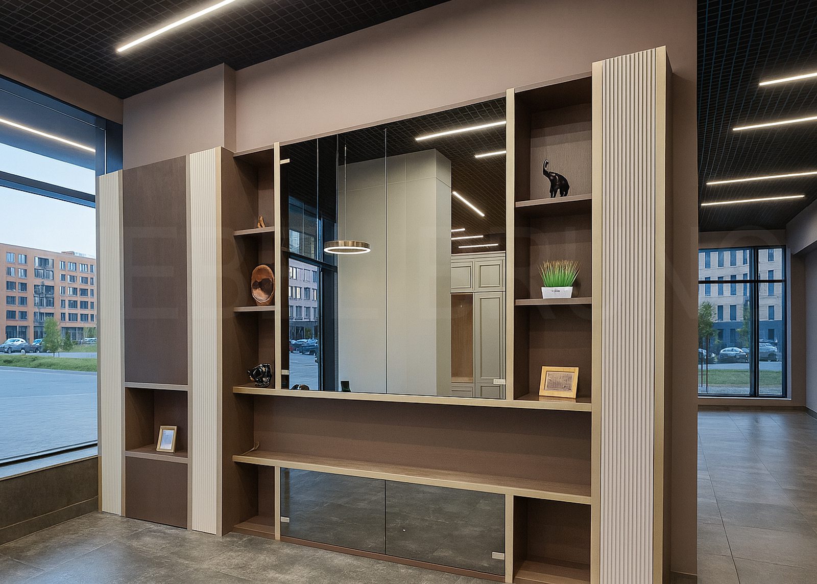 Современная зона хранения с зеркалом для гостиной или прихожейСтиль: современный минимализм — тёплая палитра, прямые линииФасады: МДФ, отделка под светлый дуб и тёплый коричнево-тауповый оттенок с матовым финишем; фасады с зеркальными вставкамиКорпус: МДФ шпон дубаФурнитура: петли Blum с доводчиком