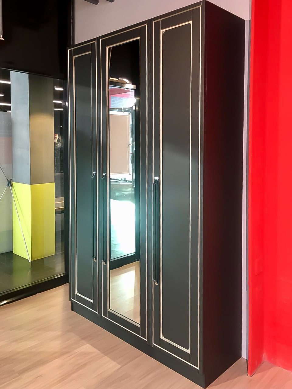 Трёхстворчатый шкаф для прихожей или спальни в стиле современной классики: фасады из МДФ, окрашенные в глубокий графитовый оттенок с матовым финишем и тонкой золотой фрезеровкой, центральная дверь с зеркалом, корпус из ЛДСП в тон, фурнитура Blum, лаконичные металлические ручки.