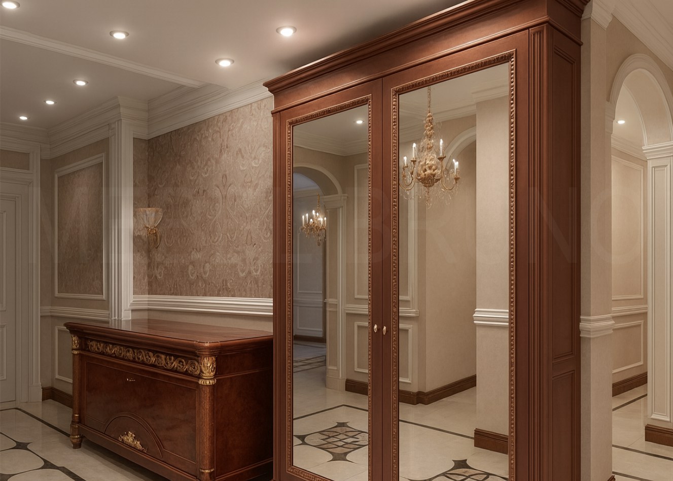 Двухстворчатый шкаф с зеркальными фасадами для прихожей или холла в классическом стиле: фасады из МДФ/массива, шпонированные в тёплый ореховый оттенок с резным кантом и лёгкой золотой патиной, корпус в тон, фурнитура Blum, изящные круглые ручки под латунь, зеркала во всю высоту визуально расширяют п...