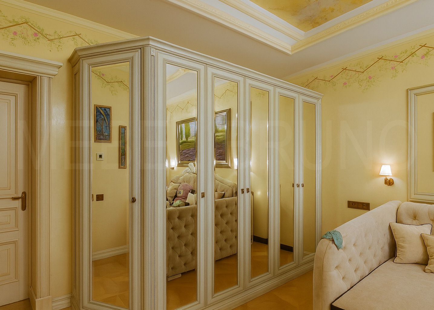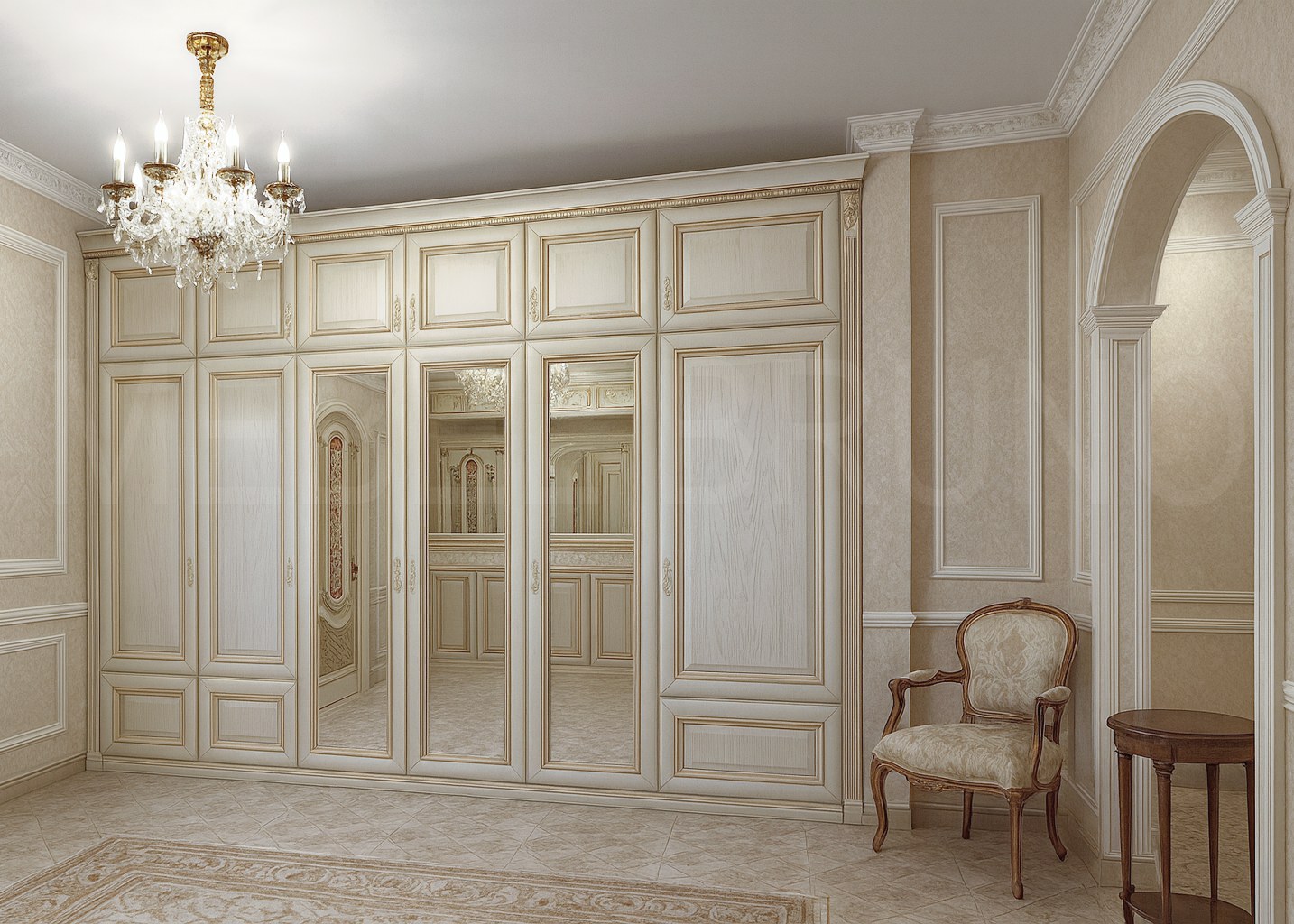 Встроенный шкаф-гардероб вдоль стены в классическом стиле: фасады из МДФ/шпона, окрашенные в светлый оттенок слоновой кости с золотой патиной и фрезеровкой, центральные двери с зеркалами во всю высоту, корпус в тон, изящные ручки под золото.