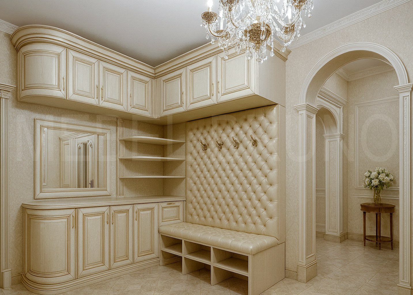 Угловой гарнитур для прихожей в классическом стиле: фасады из МДФ/шпона, окрашенные в оттенок слоновой кости с золотой патиной и фрезеровкой, верхние шкафа образуют единый карниз, зона с мягкой стеганой панелью и сиденьем обтянута экокожей, снизу — открытые ячейки для обуви, сбоку — тумба с зеркалом...