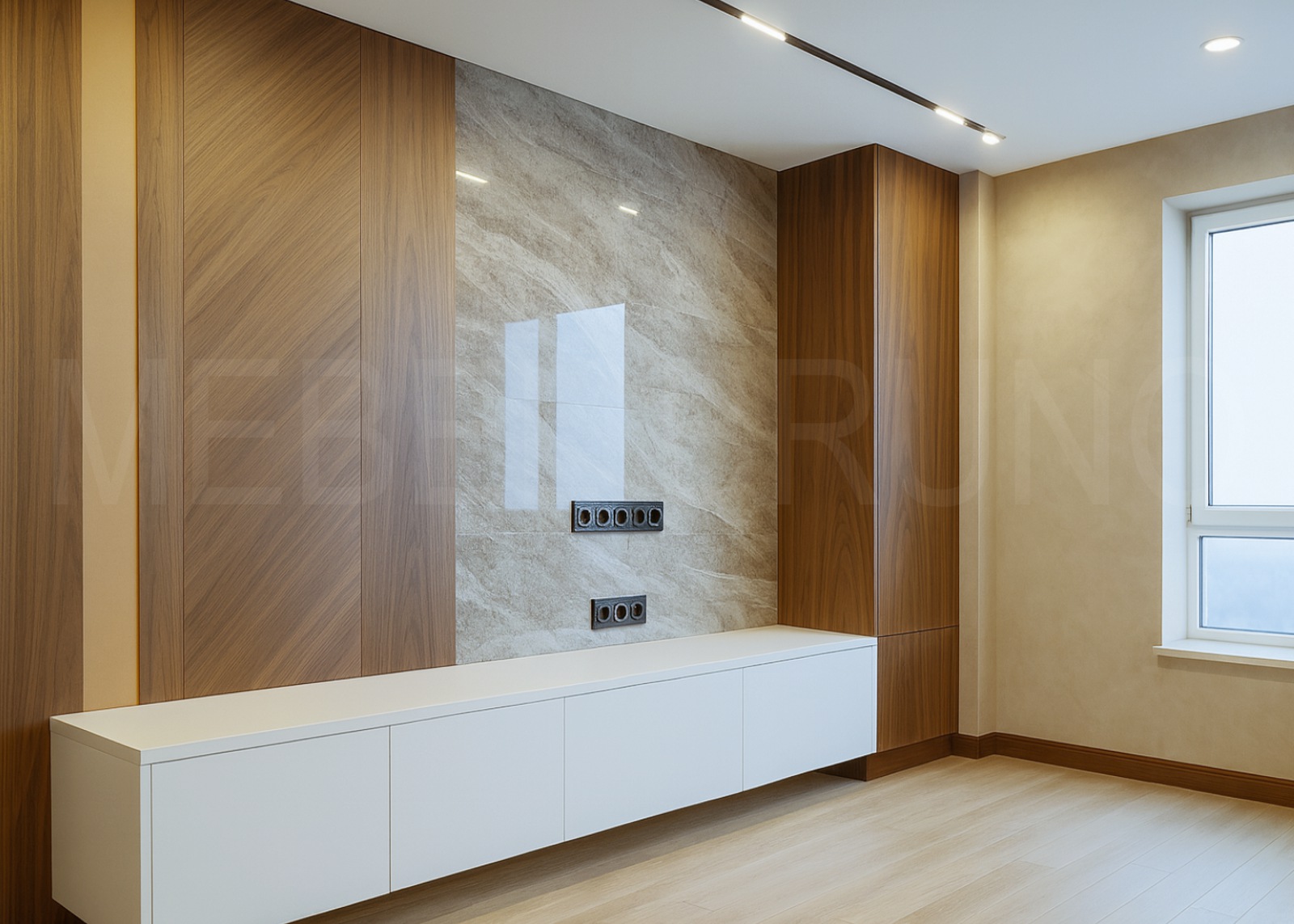 Телевизионная зона с подвесной тумбой для гостиной в современном минималистичном стиле: фасады тумбы из МДФ, окрашенные в тёплый светлый оттенок с матовым финишем, корпус и вертикальные панели — шпонированное дерево в тоне ореха, центральная часть стены облицована крупноформатной плитой «под камень»...