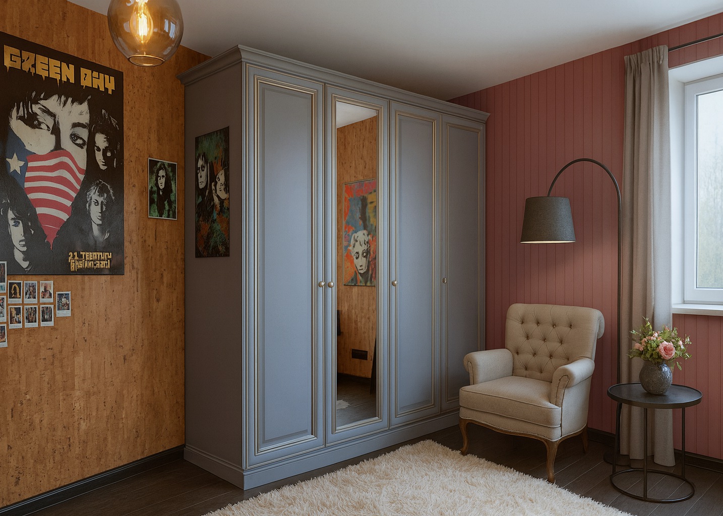 Четырёхстворчатый шкаф для спальни или подростковой комнаты в стиле современной классики: фасады из МДФ, окрашенные в пепельно-серый оттенок с матовым финишем и тонкой золотой патиной по фрезам, центральная дверь с зеркалом, корпус из ЛДСП в тон, круглые ручки под латунь, фурнитура с доводчиками