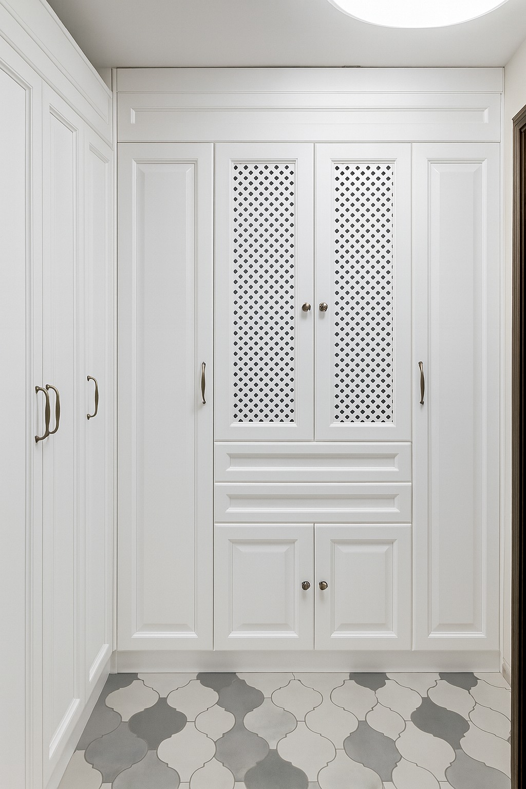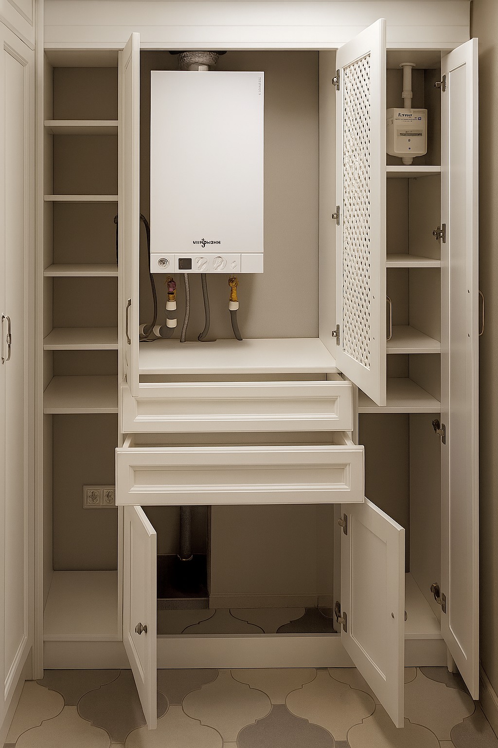 Встроенный технический шкаф для газового оборудования, выполнен в неоклассическом стиле с акцентом на симметрию и декоративные элементы.Стиль: неоклассика — панели, молдинги, симметрия, декоративные решётки.Фасады: МДФ, окрашенный в матовый белый цвет по RAL 9003.Корпус: ЛДСП Egger, декор «Белый пре...
