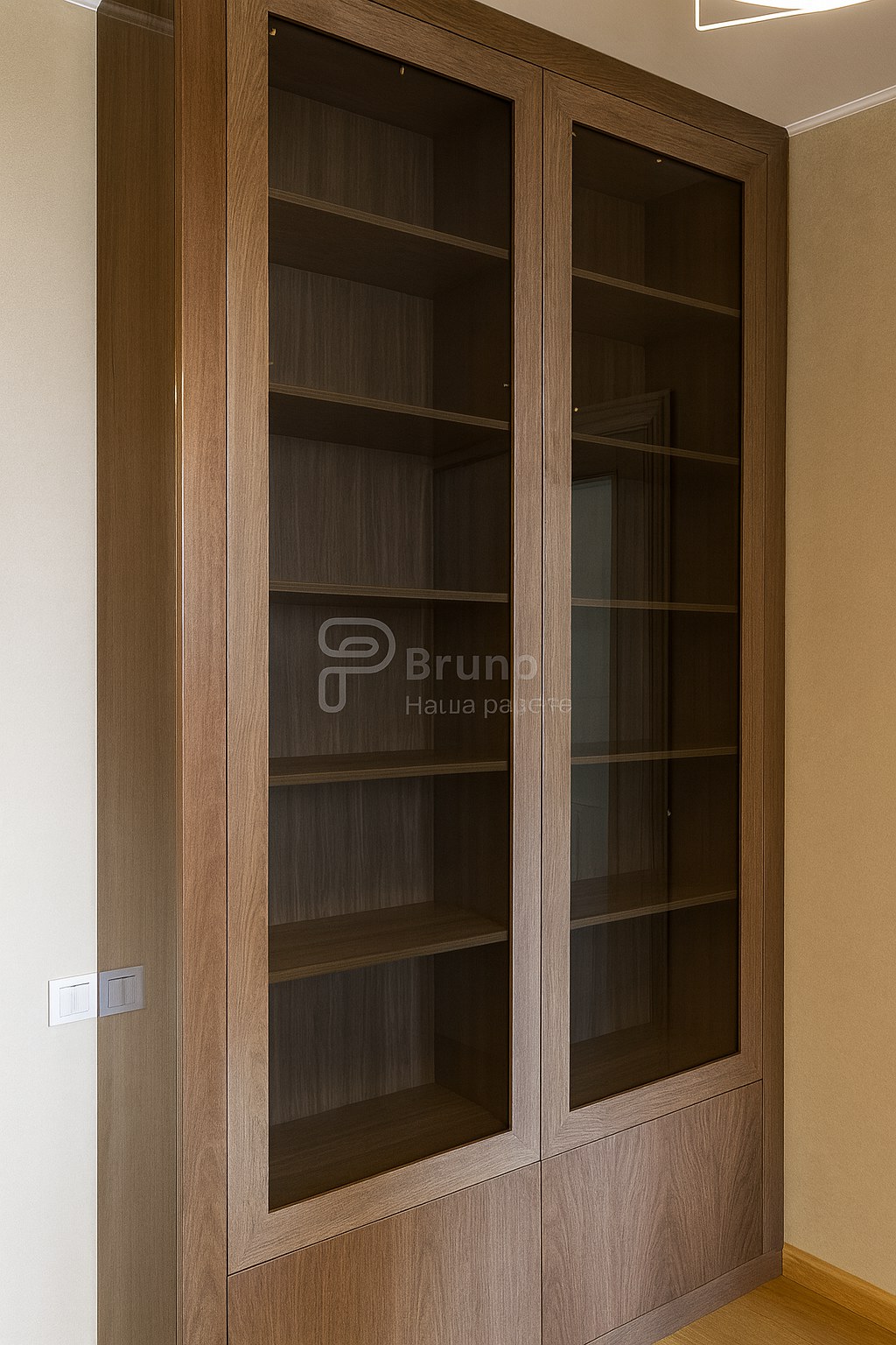 Встроенный шкаф-витрина выполнен в современном стиле с акцентом на натуральные материалы и прозрачность.Стиль: современный — строгие линии, минимализм, натуральные текстуры.Фасады: МДФ, шпонированный, покрыт прозрачным лаком с сохранением древесной текстуры.Корпус: ЛДСП Egger, декор «Орех натуральны...