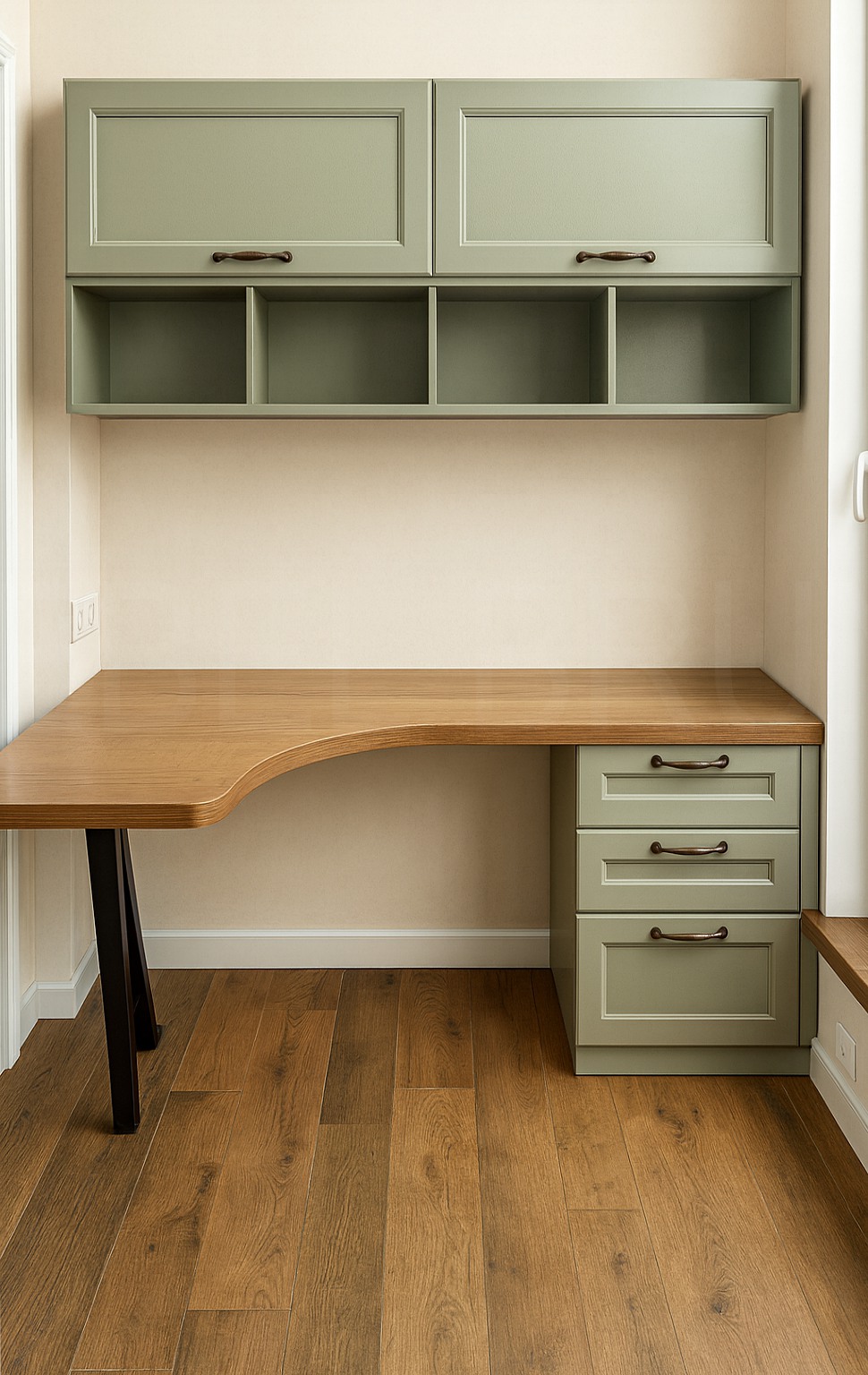 Угловое рабочее место на балконе, выполненное в скандинавском стиле с акцентом на уют и эргономику.Стиль: скандинавский — светлая палитра, лаконичные формы, функциональность.Фасады: МДФ, окрашенный по палитре NCS S3010-G70Y — серо-зелёный с матовым финишем.Корпус: ЛДСП Egger, декор «Дуб Гладстоун пе...